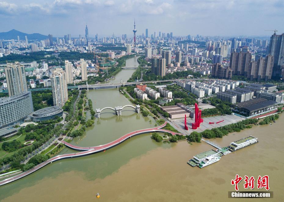 7月10日,航拍長(zhǎng)江與南京秦淮河交匯處,樹(shù)木淹入水中。當(dāng)日,江蘇水利廳發(fā)布的水情信息顯示,長(zhǎng)江南京段水位已降至警戒線以下。中新社記者泱波 攝