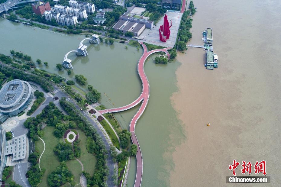 7月10日,航拍長江與南京秦淮河交匯處,江水與河水“涇渭分明”。當日,江蘇水利廳發(fā)布的水情信息顯示,長江南京段水位已降至警戒線以下。中新社記者泱波 攝
