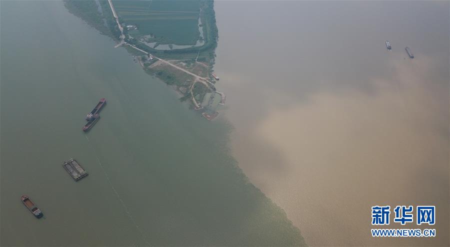 長江和鄱陽湖在江西省九江市湖口縣石鐘山附近交匯,形成江湖兩色美景(8月5日無人機(jī)拍攝)。 新華社記者 金立旺 攝