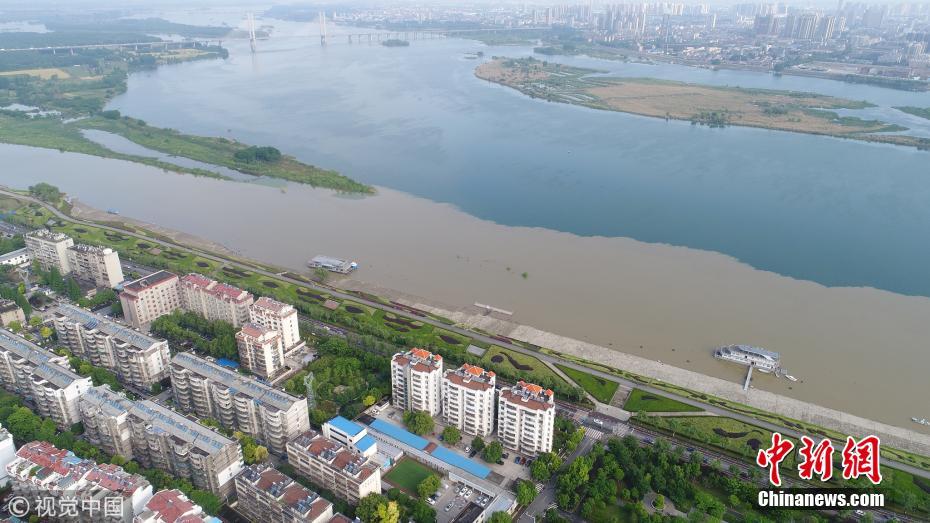 5月7日,湖北省襄陽市,無人機航拍的漢江長虹大橋處涇渭分明的漢江水面。強暴雨沖刷經(jīng)過去冬今春的田野地表積累的塵土,經(jīng)支流與主河道匯入時,充滿污泥的洪水與主河道上清澈的丹江水形成難得一見的涇渭分明景觀。王虎攝 圖片來源:視覺中國