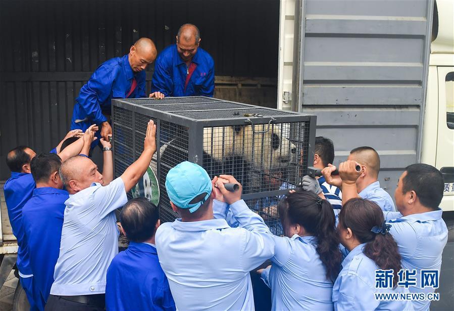 8月20日,工作人員將大熊貓?zhí)锨巴鶛C(jī)場的運(yùn)輸車。 新華社記者 許暢 攝