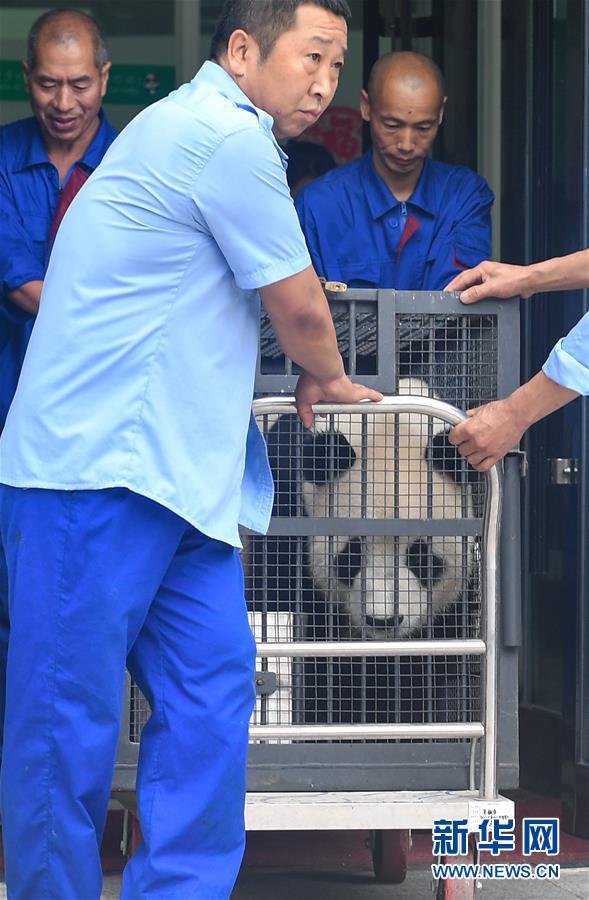 8月20日,工作人員推送大熊貓至運輸車處。 新華社記者 許暢 攝