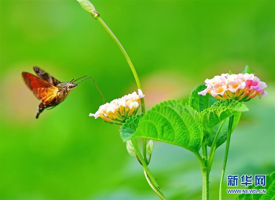 在福建省福州市溫泉公園,透翅天蛾在花間飛舞(8月18日攝)。近日,福建省福州市溫泉公園內(nèi)的馬纓丹大面積開(kāi)放?;t、草綠、蟲(chóng)飛,構(gòu)成了一幅和諧的閩都生態(tài)圖景。 新華社記者梅永存攝