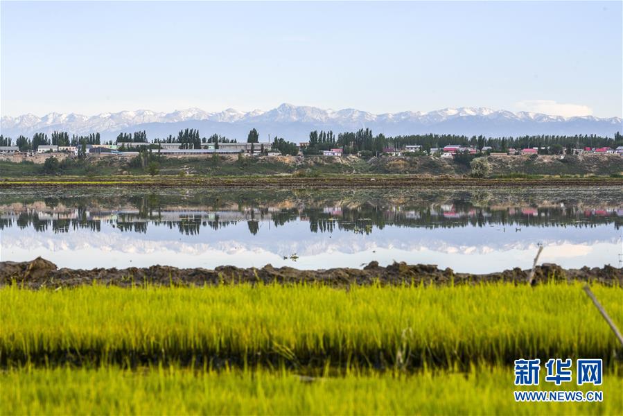 在新疆察布查爾錫伯自治縣種羊場托海依村拍攝的一處農田,秧苗與遠處的雪山相映成趣(5月21日攝)。近日,隨著氣溫漸高,地處新疆伊犁河谷的察布查爾錫伯自治縣迎來插秧高峰期,田間地頭一派繁忙景象。塊塊稻田水滿如鏡,田間防護林枝繁葉茂,遠處雪山依稀可見,如一幅在大地上鋪展開的生態(tài)畫卷。新華社記者胡虎虎 攝