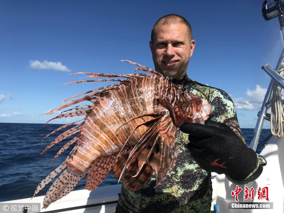 8月21日訊(具體拍攝時間不詳),近日,來自長島的Timothy Blasko打破了記錄,他捕獲了大西洋最重的獅子魚。37歲的Timothy Blasko是一名技術精湛的捕魚者,當天,他和朋友們在佛羅里達群島伊斯拉莫拉達海岸捕魚時,遇到了這條大魚。Timothy向朋友要來了魚叉,瞄準大魚的下方位置叉去,正中目標成功捕獲。當他們把這條魚和當天捕獲的其它魚排在一起時,他們猜測這條魚可能會破紀錄?!八喼笔仟{子魚中的哥斯拉!” Timothy描述道,“這條巨大的獅子魚重達3.1磅,刷新了大西洋迄今最重獅子魚的國家紀錄?!眻D片來源:視覺中國