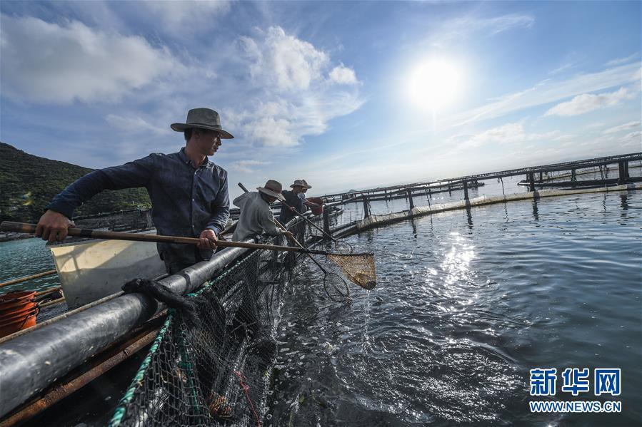 8月18日,南麂島海域的“海上牧場(chǎng)”養(yǎng)殖區(qū)內(nèi),漁民正捕撈大黃魚,處于仿生養(yǎng)殖環(huán)境的大黃魚需要生長(zhǎng)2至3年。進(jìn)入8月,浙江省溫州市平陽縣南麂鎮(zhèn)海域上大片的大黃魚、貽貝等特色海產(chǎn)品養(yǎng)殖區(qū)域迎來豐收季節(jié),養(yǎng)殖戶們駕駛漁船在養(yǎng)殖區(qū)海域進(jìn)行打撈收獲,在碧海藍(lán)天下構(gòu)成了一幅“海上牧場(chǎng)”的美麗豐收景象。近年來,南麂鎮(zhèn)政府引導(dǎo)漁民養(yǎng)殖戶充分發(fā)揮“靠海吃?!钡馁Y源優(yōu)勢(shì),大力發(fā)展海洋養(yǎng)殖經(jīng)濟(jì)和海島旅游經(jīng)濟(jì),實(shí)現(xiàn)了南麂由“生態(tài)美”向“產(chǎn)業(yè)美”,“產(chǎn)業(yè)美”向“經(jīng)濟(jì)美”的轉(zhuǎn)變。同時(shí)該鎮(zhèn)堅(jiān)持以大黃魚、貽貝等為特色產(chǎn)業(yè)支撐,精準(zhǔn)發(fā)展高效海洋養(yǎng)殖業(yè),重點(diǎn)培養(yǎng)一批新型職業(yè)漁民,依靠專業(yè)技術(shù)支持,實(shí)現(xiàn)深海仿生養(yǎng)殖,讓好生態(tài)造就好品質(zhì),重點(diǎn)打造南麂養(yǎng)殖品牌,組建營(yíng)銷網(wǎng)絡(luò),拓展特色海產(chǎn)品市場(chǎng)。新華社記者 徐昱攝