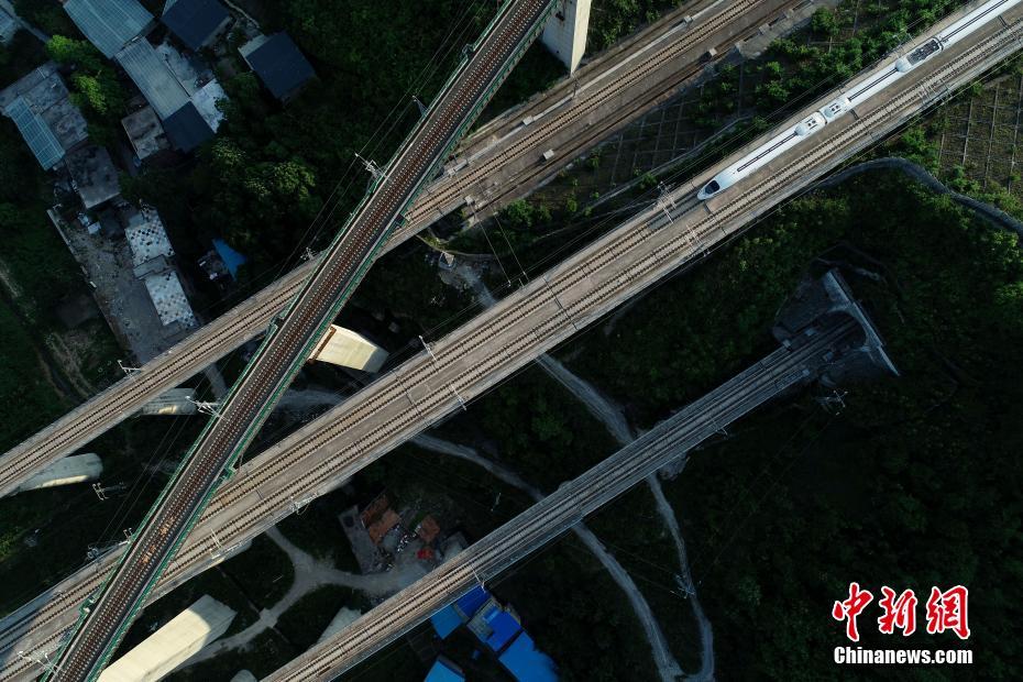 5月16日,航拍貴陽市郊交織的五條高鐵線路,一列動(dòng)車駛出隧道。貴州省地處中國(guó)西南腹地,高原山地居多,因此高鐵建設(shè)的橋隧占比較高。在貴陽市烏當(dāng)區(qū)新添寨,高鐵滬昆線、貴廣客運(yùn)專線、貴開城際客運(yùn)專線的隧道和橋梁交織在一起,形成“五洞五橋”并行。中新社記者賀俊怡 攝