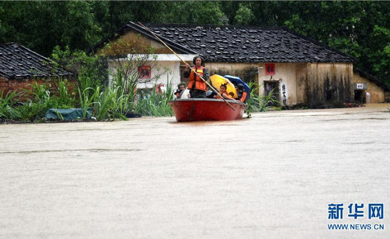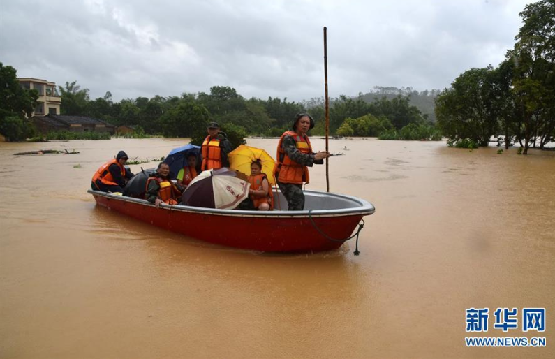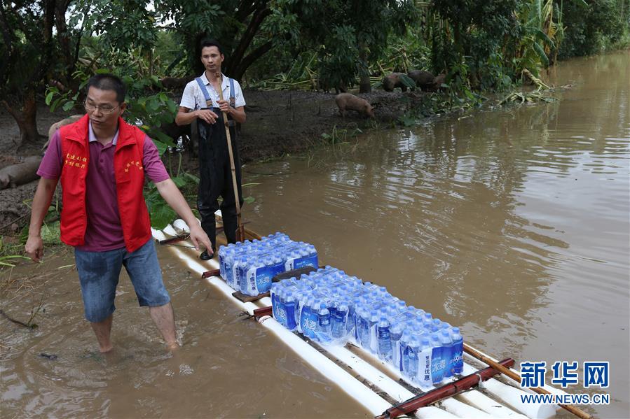 9月18日,在廣東省陽(yáng)江市陽(yáng)春市,人們用筏子運(yùn)送飲用水。  新華社記者張加揚(yáng)攝