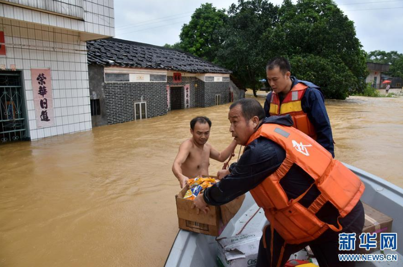9月18日,在廣東省陽(yáng)江市陽(yáng)春市,人們把食物搬運(yùn)到筏子上,準(zhǔn)備分發(fā)給受困村民。  新華社記者張加揚(yáng)攝