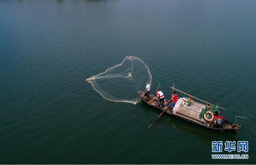 9月18日,漁民們乘坐漁船在富春江里捕撈江鮮(無(wú)人機(jī)拍攝)。