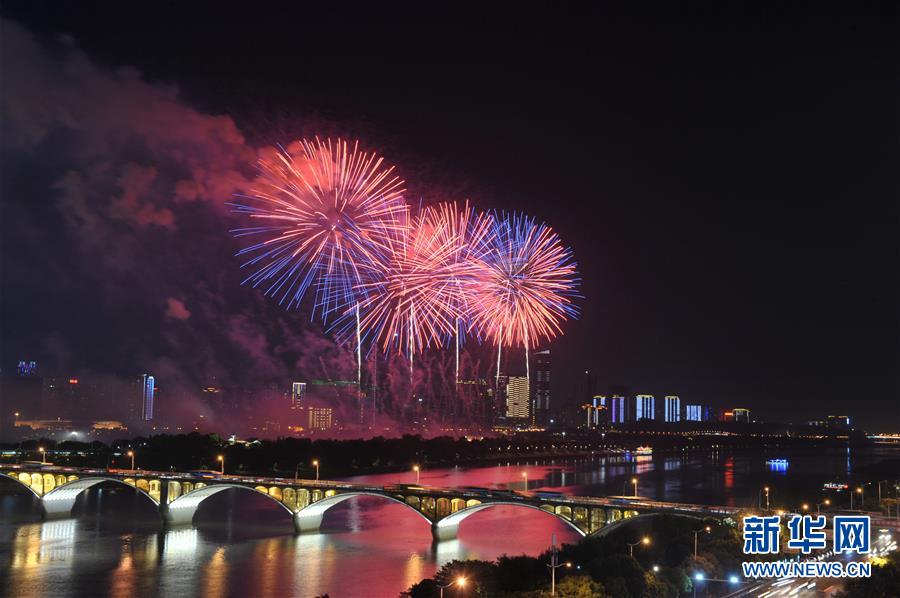 這是9月19日拍攝的長沙湘江橘子洲焰火晚會現(xiàn)場。新華社記者 龍弘濤 攝