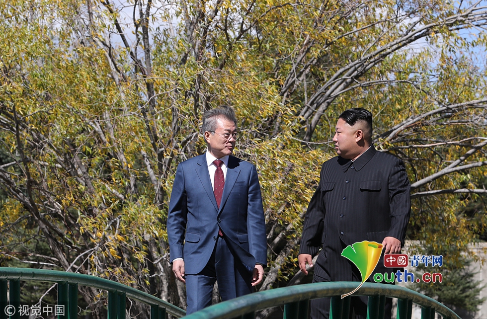當(dāng)?shù)貢r(shí)間2018年9月20日,朝鮮,韓國總統(tǒng)文在寅和朝鮮領(lǐng)導(dǎo)人金正恩在三池淵招待所共進(jìn)午餐后散步。圖片作者:Yonhap News Agency/視覺中國