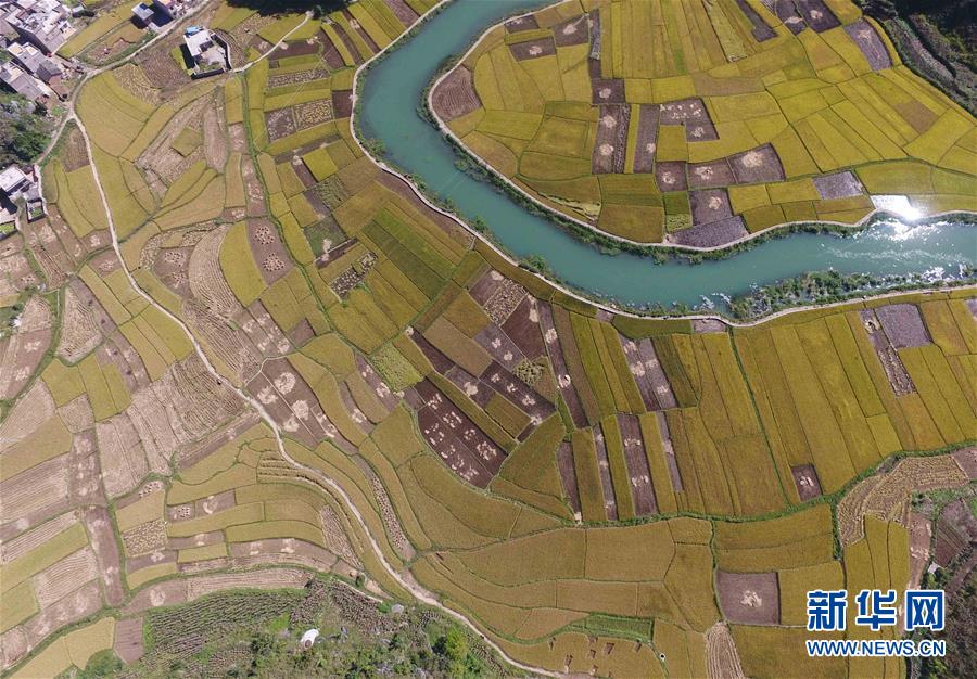 這是廣南縣八寶鎮(zhèn)壩龍村的稻田景色(9月20日無人機拍攝)。 云南省文山壯族苗族自治州廣南縣八寶鎮(zhèn)今年種植優(yōu)質(zhì)水稻22000余畝,秋收季節(jié),田野里一片金黃,景色如畫。 新華社記者楊宗友攝
