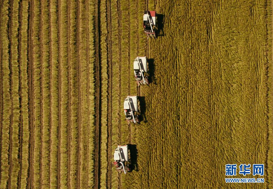 在吉林省吉林市萬昌鎮(zhèn),農(nóng)民在張楠楠成立的家庭農(nóng)場的稻田間駕駛收割機收割水稻(9月18日攝)。 新華社記者 許暢 攝