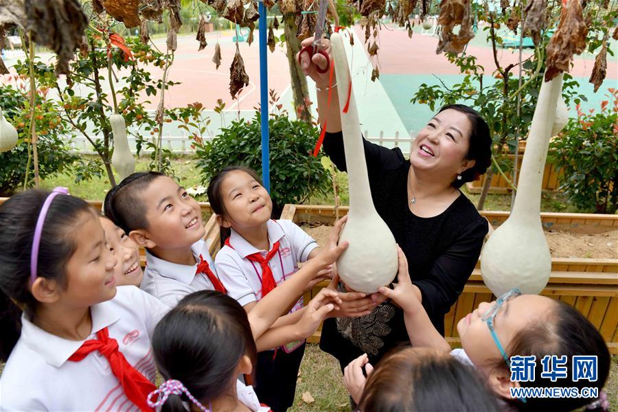 9月29日,在威海市經(jīng)濟技術開發(fā)區(qū)新都小學,老師帶著學生采摘葫蘆。