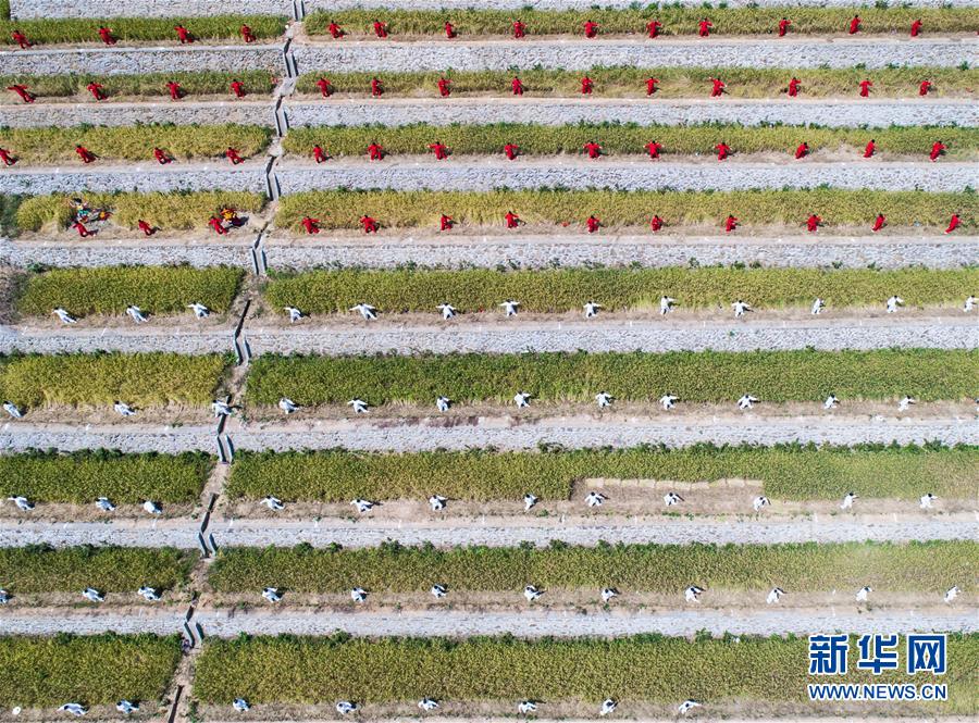 9月29日拍攝的秋日中的建德市大洋鎮(zhèn)高垣村梯田風(fēng)景。當日,2000多名太極拳愛好者在浙江省建德市大洋鎮(zhèn)高垣村的千畝梯田上參加太極拳表演,吸引很多當?shù)厝撕陀慰颓皝碛^賞,助力當?shù)亟鹎飼r節(jié)鄉(xiāng)村旅游。近兩年來,大洋鎮(zhèn)充分利用土地整治后形成的千畝梯田打造農(nóng)業(yè)觀光綜合體,發(fā)展綜合型農(nóng)業(yè)觀光旅游,為鄉(xiāng)村振興注入新活力。新華社記者徐昱攝