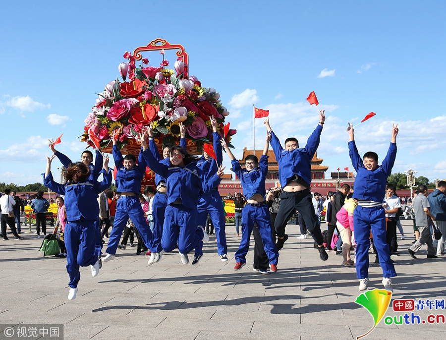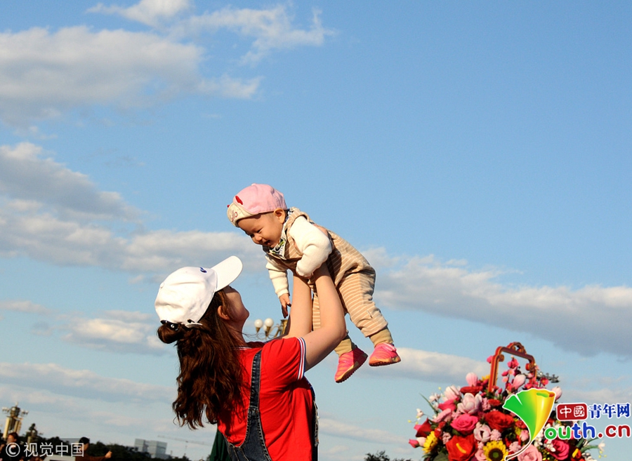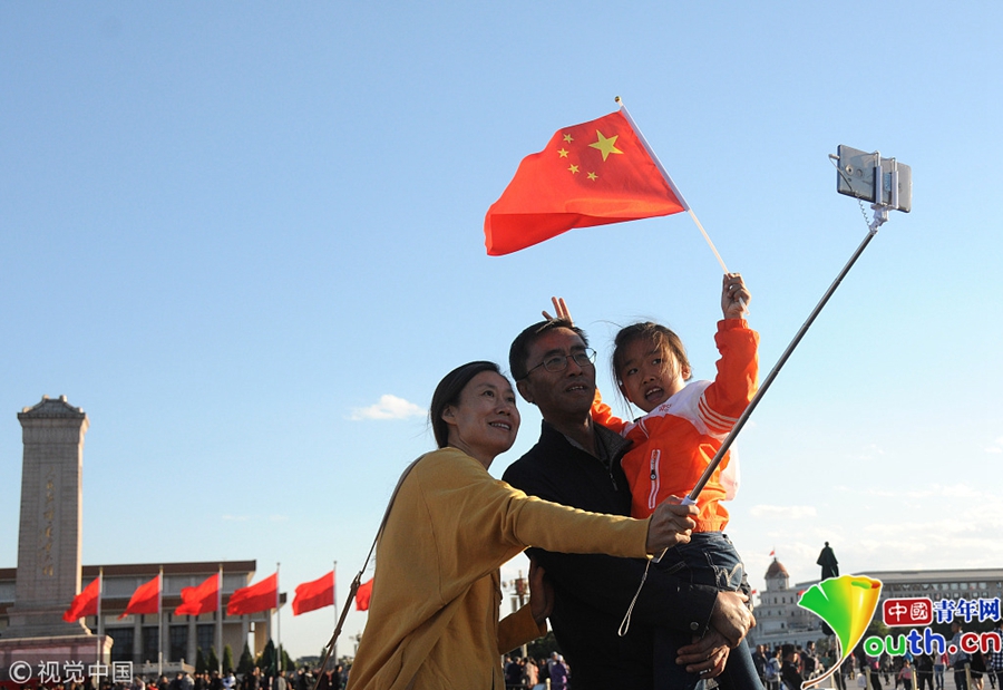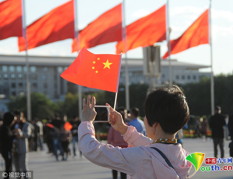 2018年9月29日,北京迎來(lái)高顏值好天氣,天安門(mén)廣場(chǎng)“祝福祖國(guó)”花壇在藍(lán)天白云映襯下壯美如畫(huà)。游客紛紛拿起手機(jī)、相機(jī)拍照留影充滿節(jié)日氣氛。