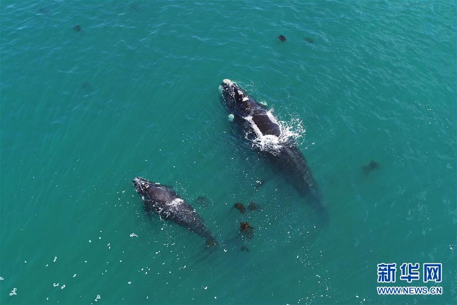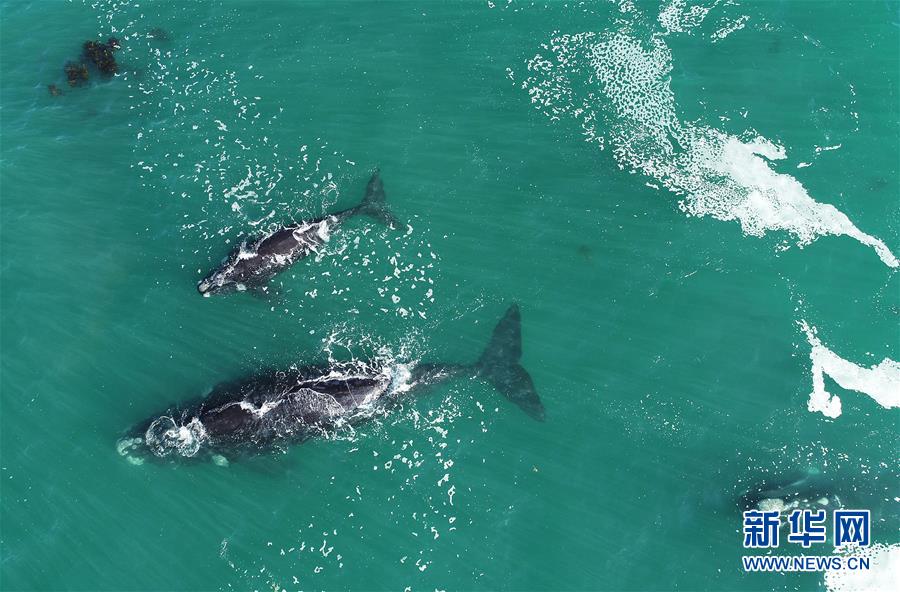 9月30日,在南非赫曼紐斯小鎮(zhèn)附近海面上,2頭南露脊鯨在海岸邊暢游。9月29日,位于開普敦以東約115公里的赫曼紐斯小鎮(zhèn)迎來(lái)2018年的鯨魚節(jié),來(lái)自世界各地的游客可乘船出海觀鯨,也可在岸邊等待鯨魚的到來(lái)。新華社記者陳誠(chéng)攝