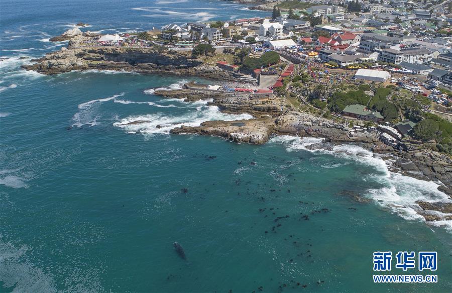 9月30日,在南非赫曼紐斯小鎮(zhèn)附近海面上,南露脊鯨在海岸邊暢游。9月29日,位于開普敦以東約115公里的赫曼紐斯小鎮(zhèn)迎來(lái)2018年的鯨魚節(jié),來(lái)自世界各地的游客可乘船出海觀鯨,也可在岸邊等待鯨魚的到來(lái)。新華社記者陳誠(chéng)攝