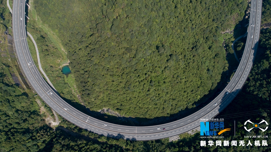 這是廈蓉高速長(zhǎng)下坡龍巖路段的道路景觀,高速路走向形成罕見(jiàn)的半圓形。改擴(kuò)建工程竣工之后,長(zhǎng)下坡將改成上行線,變?yōu)樯掀侣范危o(wú)人機(jī)拍攝)。新華網(wǎng) 肖和勇 攝