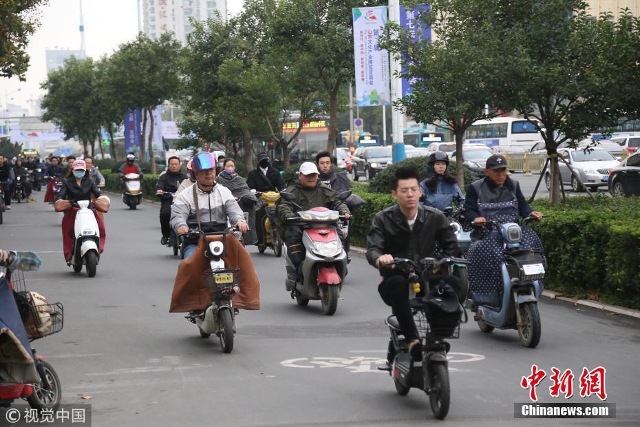2018年10月9日,山東濟(jì)南,昨日一場(chǎng)秋雨過(guò)后開(kāi)始降溫,今天清晨最低氣溫只有6度,馬路上不少上班族穿上羽絨服騎車(chē)趕上班路。 圖片來(lái)源:視覺(jué)中國(guó)