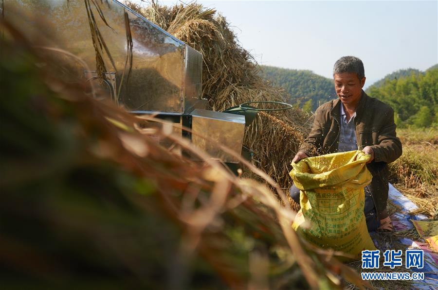 10月9日,一名村民在上堡鄉(xiāng)的高山梯田利用機(jī)械進(jìn)行脫粒裝袋。  新華社記者 胡晨歡 攝