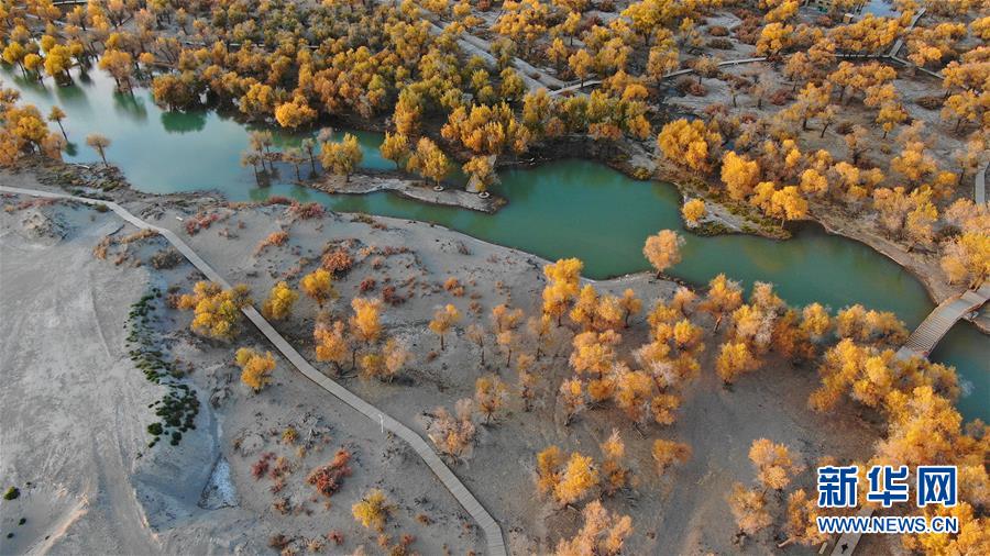 這是在內(nèi)蒙古自治區(qū)額濟納旗拍攝的胡楊林(10月10日無人機拍攝)。 金秋時節(jié),內(nèi)蒙古自治區(qū)額濟納旗胡楊林如同披上金裝,成為大漠中的一抹亮色,吸引眾多中外游客前來觀賞游玩。 新華社記者鄒予攝
