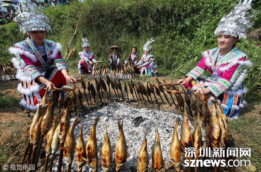 廣西柳州市融水縣山區(qū)有插秧時節(jié)放養(yǎng)鯉魚苗的習俗,金秋時節(jié)稻熟魚肥,收稻燒魚成為別致一景。