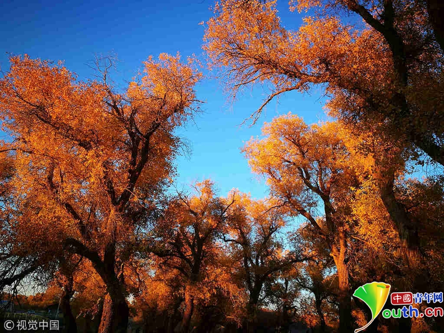中國(guó)青年網(wǎng)北京10月9日電 2018年10月7日至8日,內(nèi)蒙古自治區(qū)阿拉善盟額濟(jì)納旗,地處巴丹吉林沙漠。額濟(jì)納河兩岸壯觀的胡楊林堪稱大漠的一顆綠色明珠,每年深秋時(shí)節(jié)的第一場(chǎng)秋霜過(guò)后,大片的胡楊樹(shù)葉由綠變黃,一眼望去,陽(yáng)光下金色的樹(shù)葉襯著湛藍(lán)的天空于風(fēng)中婆娑起舞,鮮明的影調(diào),亮麗的色彩,令人流連忘返。