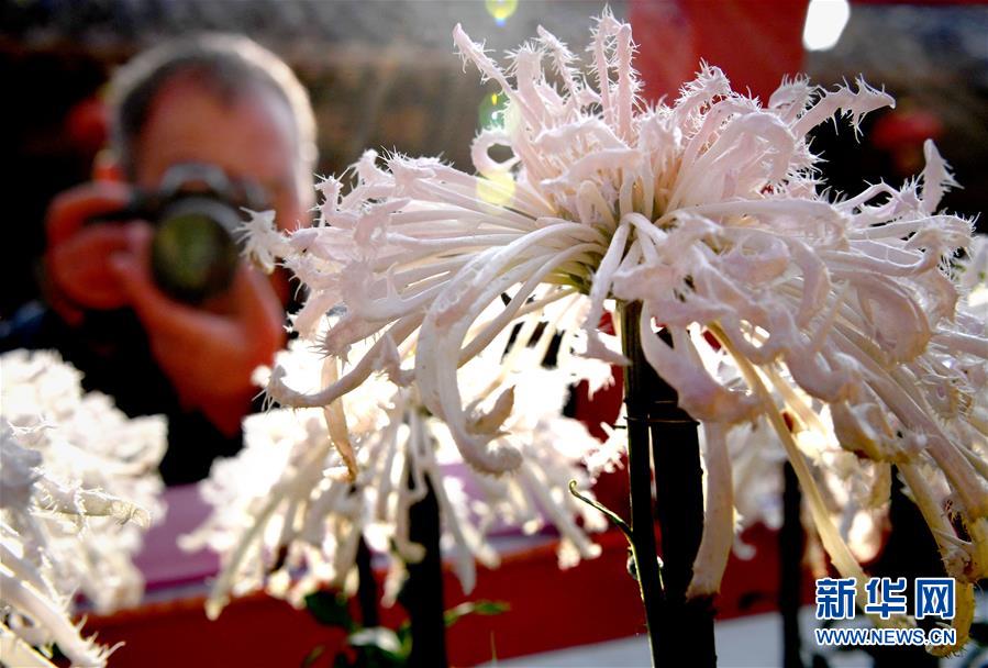 10月17日,游客在開封清明上河園內(nèi)拍攝展出的菊花。重陽時節(jié),各色菊花競相綻放,把古都開封裝點得分外秀美,吸引眾多游客前來觀賞游玩。 新華社記者 李安 攝
