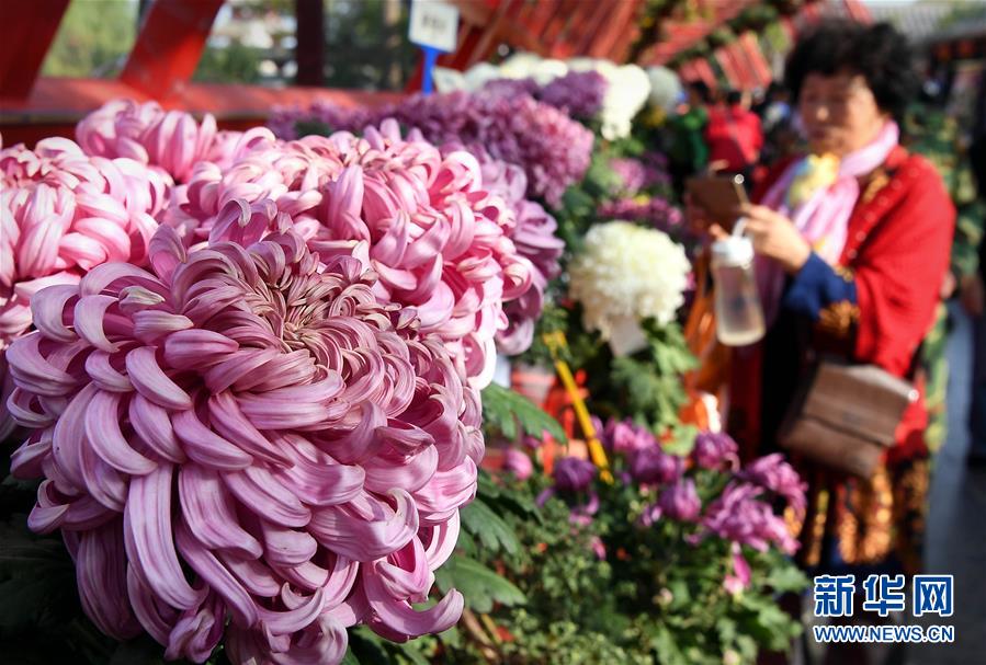 10月17日,游客在開封清明上河園觀賞菊花。重陽時(shí)節(jié),各色菊花競(jìng)相綻放,把古都開封裝點(diǎn)得分外秀美,吸引眾多游客前來觀賞游玩。 新華社記者 李安 攝