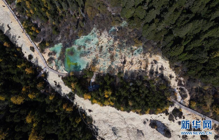 俯瞰黃龍溝盆景池(10月19日無人機(jī)拍攝)。深秋時節(jié),在雪山、藍(lán)天、白云和彩林映襯下,黃龍溝中的彩池色彩更加斑斕,目前黃龍景區(qū)進(jìn)入觀賞最佳時節(jié)。黃龍風(fēng)景名勝區(qū)位于四川省松潘縣境內(nèi),以彩池、灘流、雪山、峽谷、森林等聞名,享有“人間瑤池”“圣地仙境”之美譽。新華社記者 江宏景攝