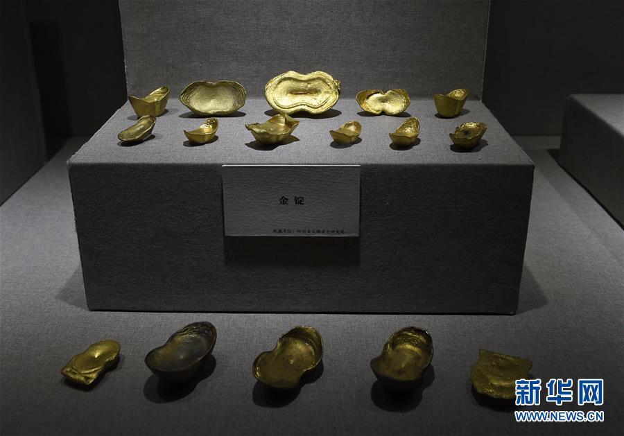 這是在四川博物院展出的金錠(10月21日攝)。 當(dāng)日,由四川省文化廳、四川省文物局、眉山市人民政府主辦的“江口沉銀——四川彭山江口古戰(zhàn)場(chǎng)遺址考古成果展”在四川博物院開幕。此次展覽共展出文物521件,展期將持續(xù)至2019年1月18日。四川彭山江口古戰(zhàn)場(chǎng)遺址是2017年度全國(guó)十大考古新發(fā)現(xiàn)之一,共發(fā)現(xiàn)文物42000余件。 新華社記者劉坤攝
