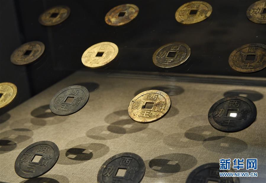 這是在四川博物院展出的“西王賞功”錢幣(10月21日攝)。 當(dāng)日,由四川省文化廳、四川省文物局、眉山市人民政府主辦的“江口沉銀——四川彭山江口古戰(zhàn)場(chǎng)遺址考古成果展”在四川博物院開幕。此次展覽共展出文物521件,展期將持續(xù)至2019年1月18日。四川彭山江口古戰(zhàn)場(chǎng)遺址是2017年度全國(guó)十大考古新發(fā)現(xiàn)之一,共發(fā)現(xiàn)文物42000余件。 新華社記者劉坤攝