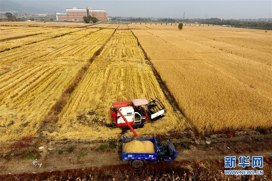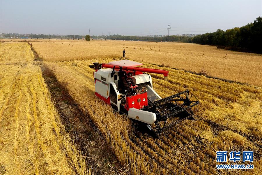 在太原市晉源區(qū)赤橋村,收割機(jī)在稻田里作業(yè)(10月17日無人機(jī)拍攝)。近日,山西省太原市晉源區(qū)2000多畝水稻迎來收割季。 金秋時節(jié),農(nóng)民們忙著收獲成熟的農(nóng)作物,喜迎豐收。 新華社記者 詹彥 攝