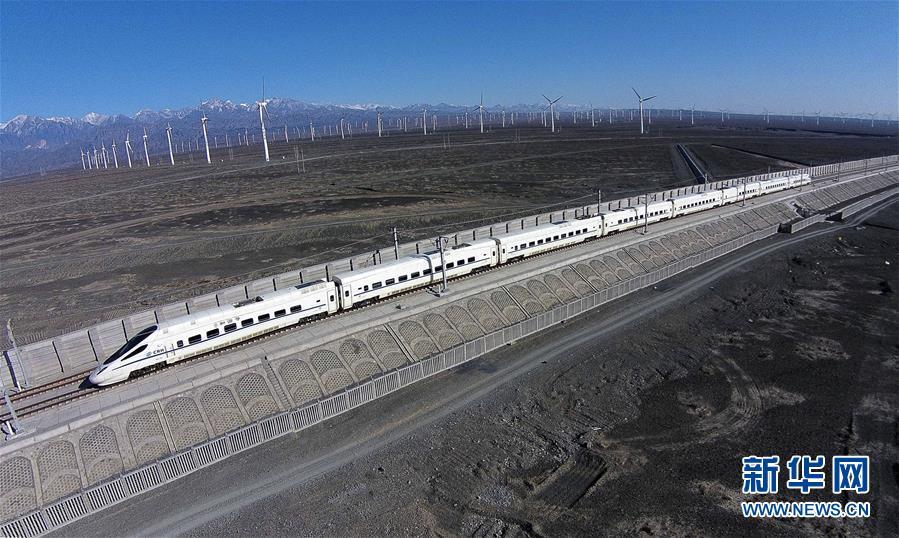 一輛和諧號動車穿行在新疆烏魯木齊達坂城風力發(fā)電場的“風車森林”里(2014年11月16日無人機拍攝)。今年以來,新疆穩(wěn)步推進新能源參與“疆電外送”、擴大與燃煤自備電廠調(diào)峰替代交易等多種電力交易方式,著力破解“綠色電力”上網(wǎng)難題,新能源發(fā)電量同比增加近13個百分點,而棄電量和棄電比實現(xiàn)“雙降”,綠色發(fā)展理念進一步落實。 新疆是我國重要的能源供應(yīng)和儲備基地,風能、太陽能儲量豐富。近年來,新疆新能源裝機總量突破2700萬千瓦,規(guī)模和占比均居全國前列。新華社記者 江文耀 攝