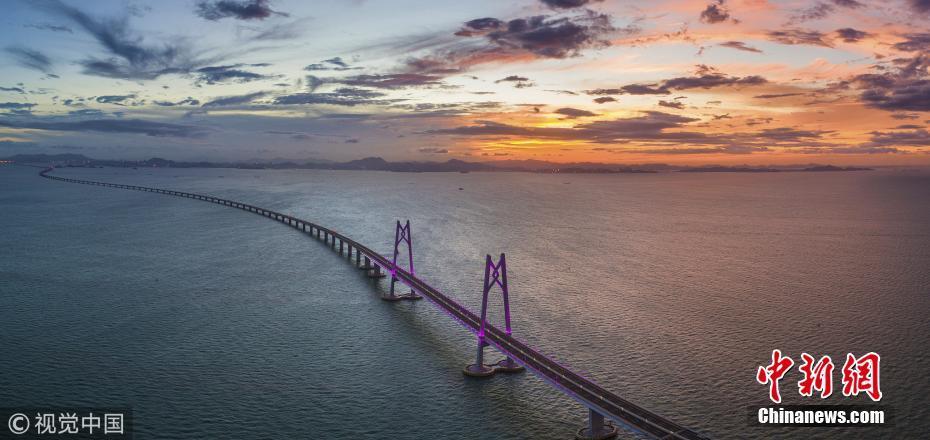 2018年7月18日,珠海,滿天紅霞,亮燈后的港珠澳大橋跨立在伶仃洋上,進入通車前的最后準備。張由瓊 攝 圖片來源:視覺中國
