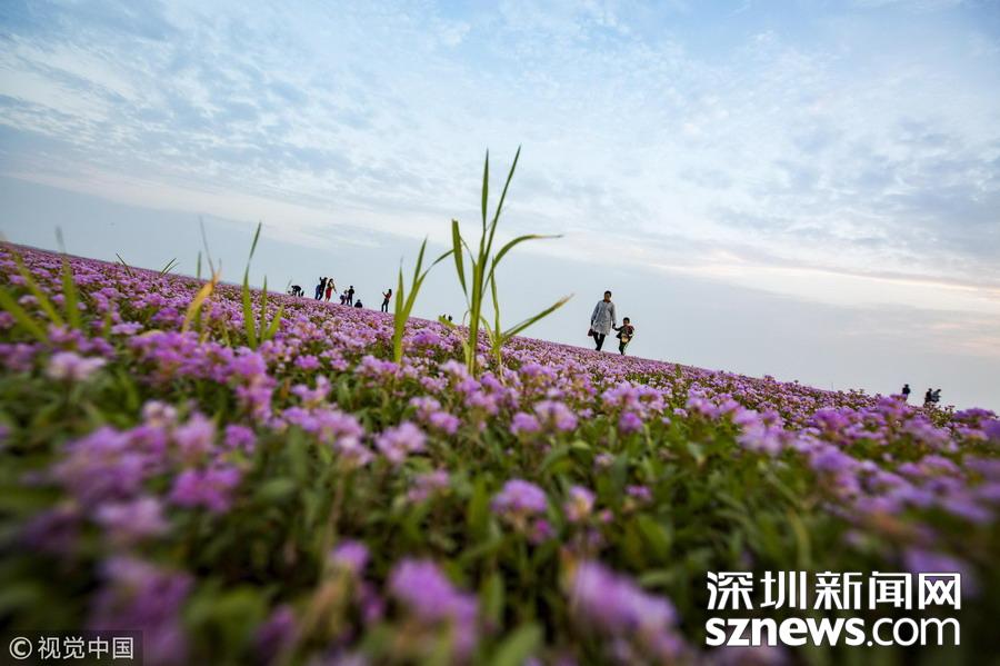 2018年10月23日,南昌,游人在江西鄱陽湖都昌濕地蓼子花海內(nèi)游玩。連日來,中國第一大淡水湖江西鄱陽湖濕地大面積蓼子花開放,秋景宜人,紫色的花海吸引大批游客前來賞景游玩。