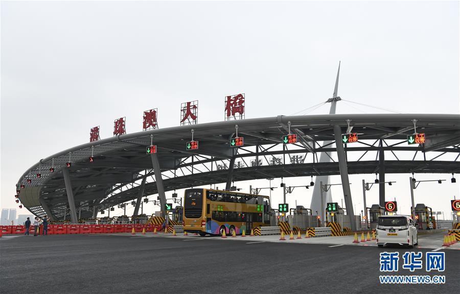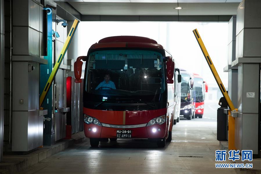 10月24日,跨境巴士在澳門口岸離境車道上通關。當日9時,港珠澳大橋正式通車。 新華社記者張金加攝