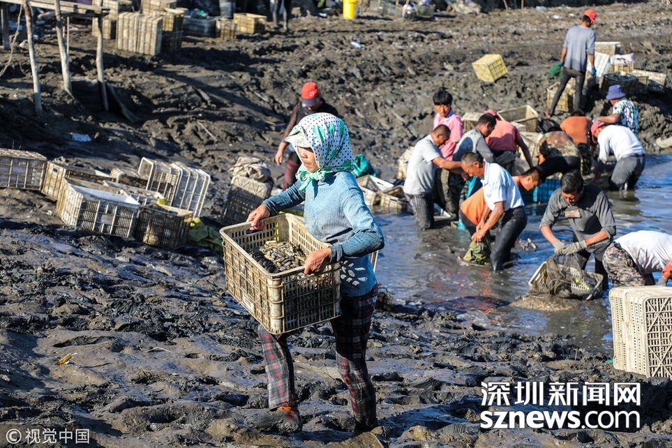深圳新聞網(wǎng)訊  2018年9月8日,遼寧丹東,早上5點(diǎn),挖蟶人紛紛下到各個(gè)池子,要在海水海泥里艱辛勞作10小時(shí),直至下午3點(diǎn)集體上岸,等待買家的運(yùn)輸車隊(duì)運(yùn)走他們的勞動(dòng)成果。9月初,遼寧沿海養(yǎng)殖區(qū)進(jìn)入養(yǎng)殖海鮮的收獲季。在東港,常常出現(xiàn)數(shù)百人乃至上千人集結(jié)在池子里挖蟶子(這里特指縊蟶,即東港當(dāng)?shù)厝怂f的小人仙。下同)的壯觀景象。在養(yǎng)殖海鮮的收獲季,成群的海鷗趁機(jī)“助陣“,人與大自然和諧共處的畫面令人嘆為觀止。