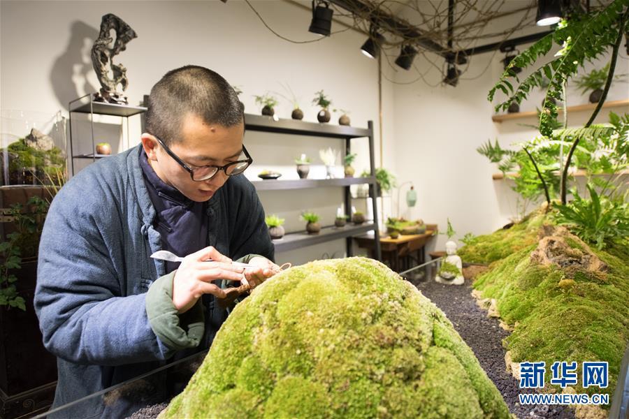 安徽籍藝術(shù)家潘銳在2012年創(chuàng)立于杭州市外桐塢村的“植覺”工作室打點(diǎn)苔蘚盆景(2018年1月14日攝)。外桐塢村是西湖西面群山中的一個小村落,傳統(tǒng)以茶葉生產(chǎn)為主要經(jīng)濟(jì)來源。自2010年以來,外桐塢村著力打造藝術(shù)村落。 新華社記者 翁忻旸 攝
