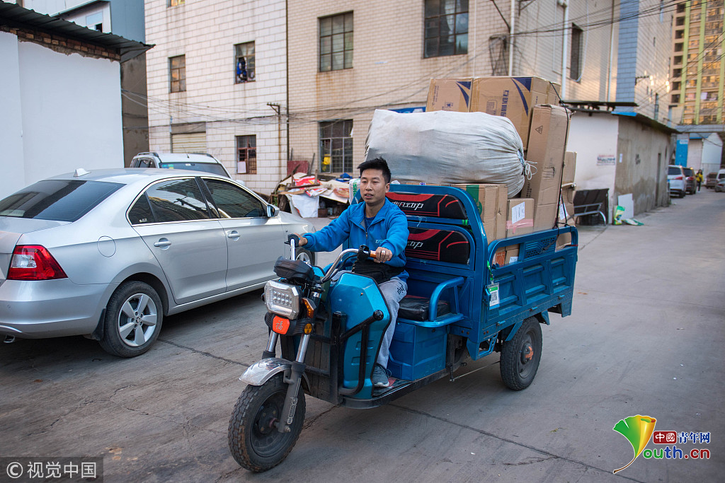 2018年10月16日,云南省昆明市,攝影師實拍90后快遞員熊忠桃的一天工作。作為一名快遞員,他25歲就買了房,9月份收入3萬多。圖片作者:銳圖