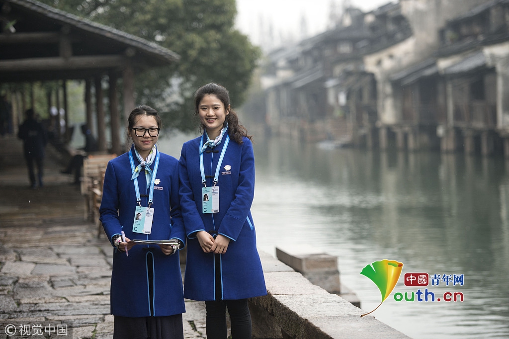 2015年12月13日,浙江嘉興,桐鄉(xiāng)烏鎮(zhèn)景區(qū),引導(dǎo)志愿者著裝上崗,她們將在景區(qū)各個站點(diǎn)開展引導(dǎo)咨詢服務(wù)。