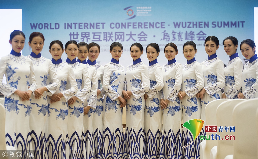 2014年11月17日,世界互聯(lián)網(wǎng)大會(huì)直播演練在浙江烏鎮(zhèn)舉行。來自浙江傳媒學(xué)院的大學(xué)生們,身著一襲青花瓷紋旗袍亮相,顯得分外嫵媚,引人注目。