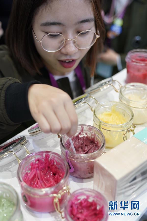 11月7日,觀眾在日本濱田醬油株式會社展臺品嘗醬油冰淇淋。 新華社記者 李鑫 攝