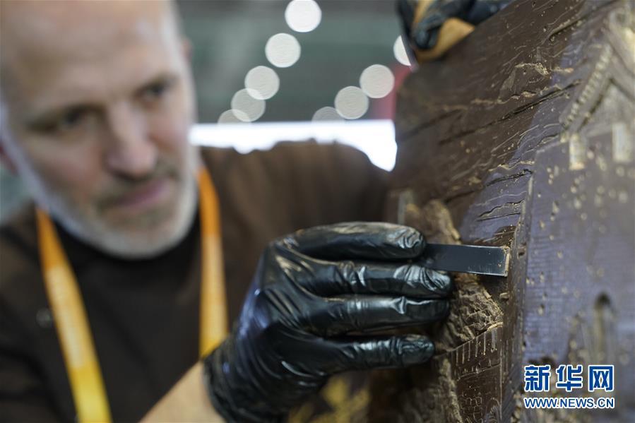 11月7日,在進博會食品及農(nóng)產(chǎn)品展區(qū),來自俄羅斯的巧克力雕塑家維塔利·波諾馬廖夫在制作中國長城主題的巧克力雕塑作品。 新華社記者 沈伯韓 攝