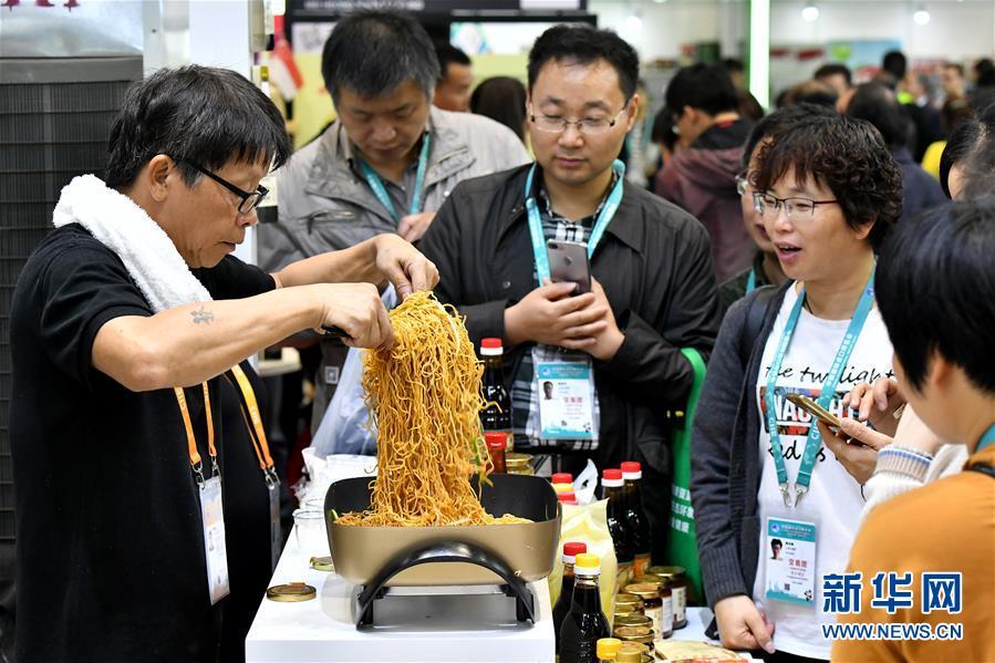 11月7日,來自新加坡廣祥泰私人有限公司的工作人員用公司生產(chǎn)的調料為觀眾現(xiàn)場烹制炒面。 新華社記者 李鑫 攝