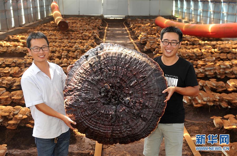 9月4日,韓子南(左)和韓子夜在展示他們培育出的直徑達(dá)1米的巨型靈芝。