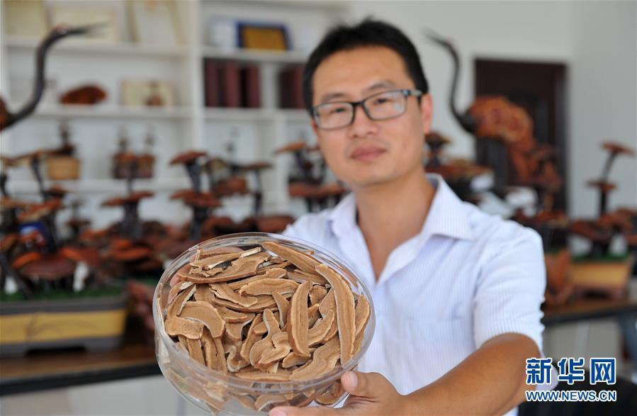 6月20日,廣宗縣大柏社村村民王志恒在展示制作的靈芝盆景。 近年來,河北省廣宗縣大柏社村積極引導(dǎo)農(nóng)民結(jié)合市場需求調(diào)整農(nóng)業(yè)產(chǎn)業(yè)結(jié)構(gòu),采取“公司+合作社+基地+農(nóng)戶”的經(jīng)營模式,發(fā)展特色靈芝種植,并開發(fā)出靈芝盆景、靈芝孢子粉等相關(guān)衍生產(chǎn)品,開辟出一條富農(nóng)創(chuàng)收新路徑。目前,大柏社村靈芝種植面積近百畝,種植各類靈芝5000余株,帶動120余名農(nóng)民就業(yè)增收。新華社記者朱旭東攝