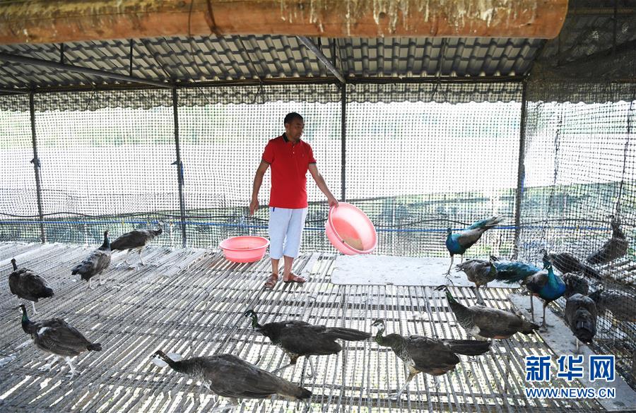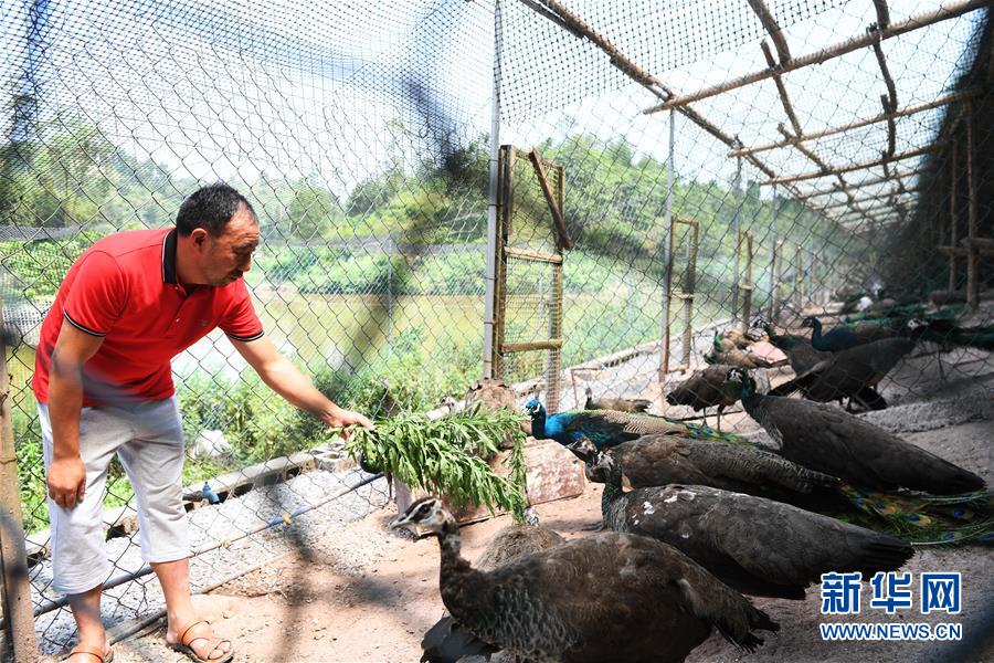 5月16日,在重慶市銅梁區(qū)永嘉鎮(zhèn)高龍村,閻仁兵在養(yǎng)殖場內(nèi)給藍(lán)孔雀喂食。 新華社記者 王全超 攝